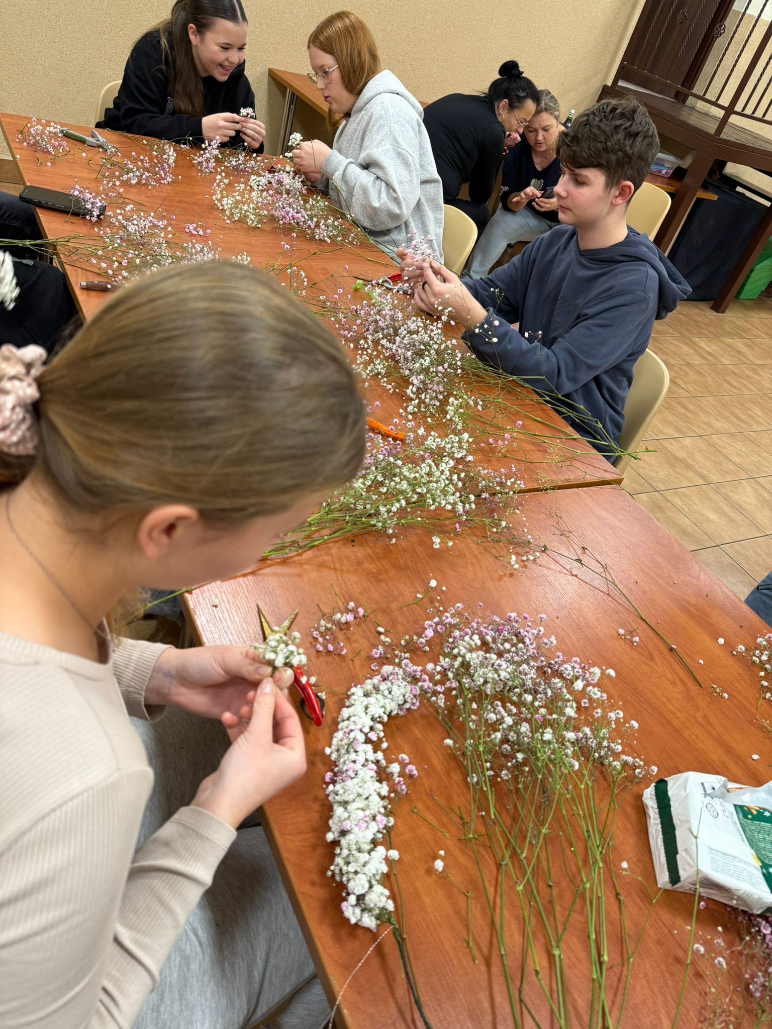 Dzisiejsze spotkanie nie ograniczyło się jednak wyłącznie do praktyki. W trakcie zajęć uczestnicy omawiali regionalne motywy i znaczenia symboliczne, które od wieków towarzyszą wiankom w lokalnych obrzędach i zwyczajach. Rozmowy dotyczyły m.in. roli poszczególnych roślin, ich symboliki w kulturze ludowej oraz sposobów, w jakie dawniej wykorzystywano wianki podczas świąt i uroczystości rodzinnych.