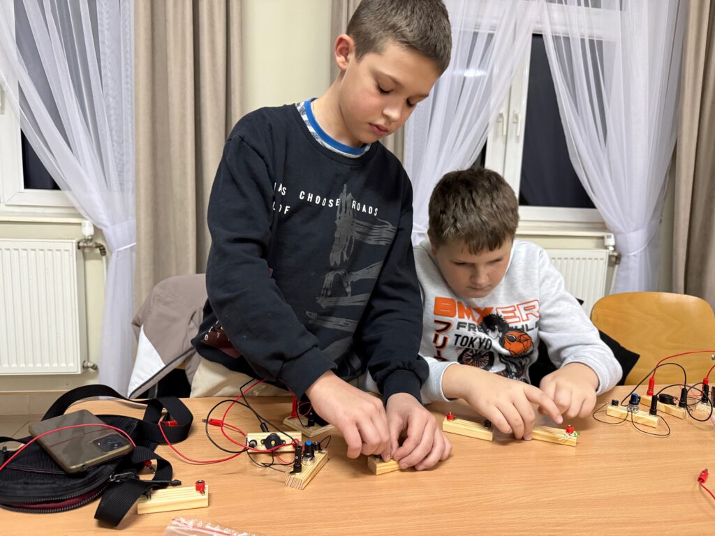 Uczestnicy z zapałem eksperymentowali z odbiornikami prądu, takimi jak diody LED i buzzery, i praktycznie łączyli elementy na podstawkach. Każdy mógł zobaczyć, jak teoria zamienia się w praktykę, a radość z własnoręcznie wykonanego obwodu była ogromna! ⚡🎵
