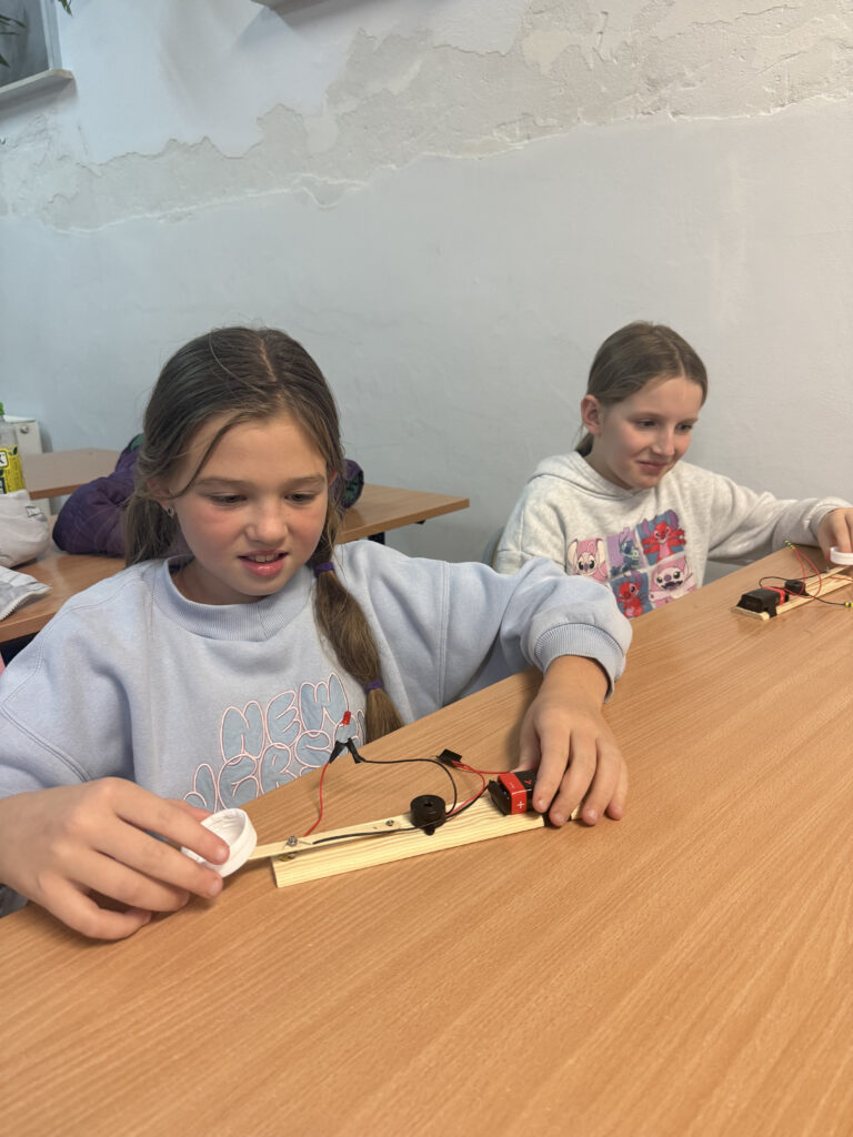 Uczestnicy poznali różne źródła zasilania oraz ich rolę w działaniu obwodu. Następnie pracowali z przewodami, przełącznikami i włącznikami, ucząc się, jak poprawnie łączyć elementy, aby układ funkcjonował prawidłowo.