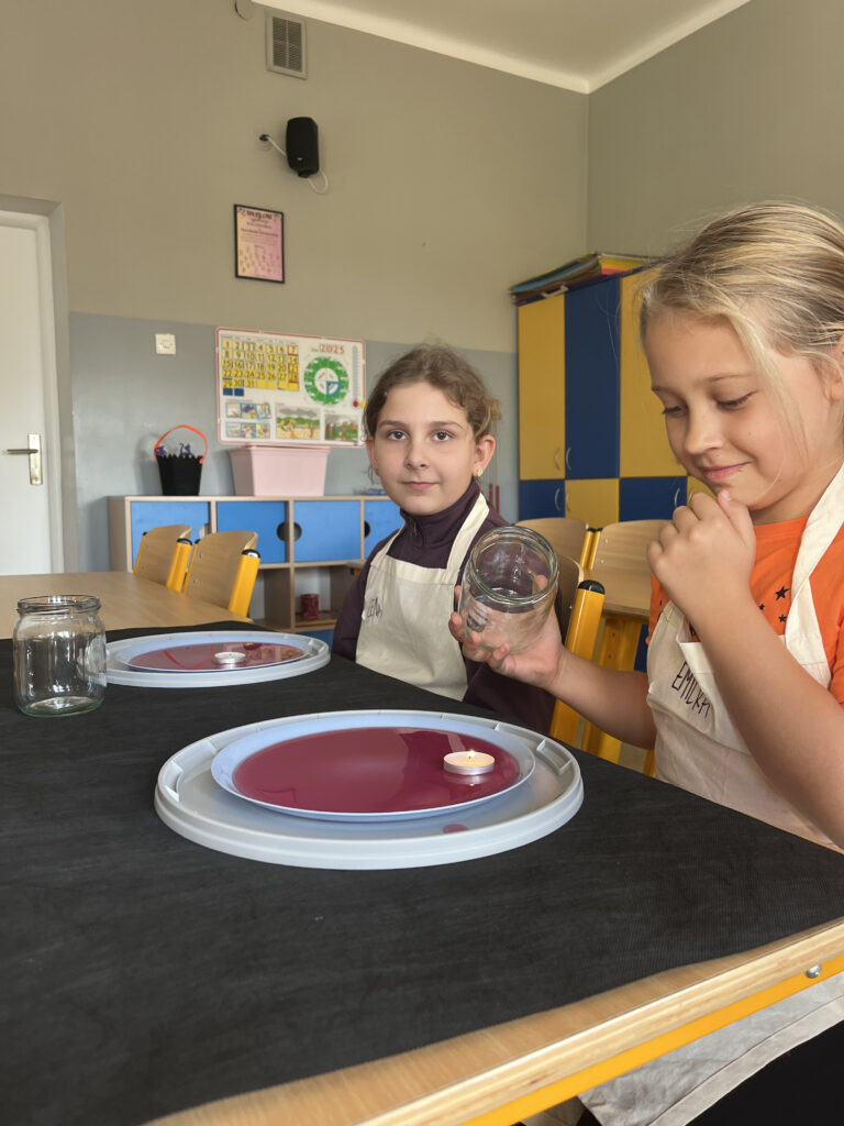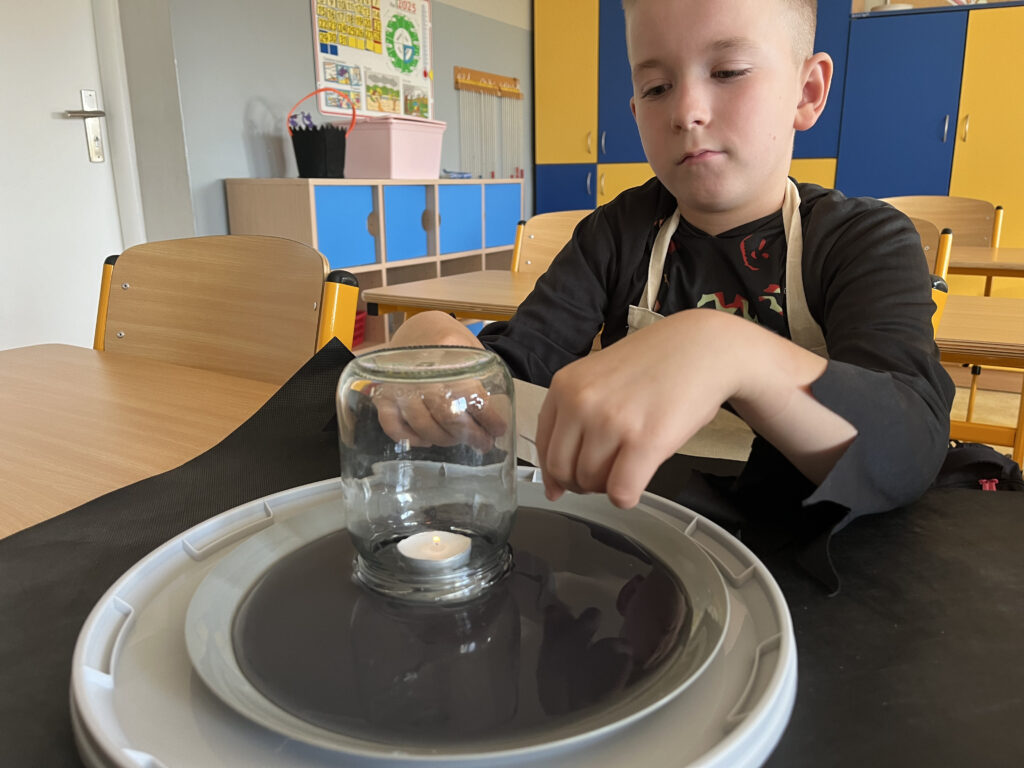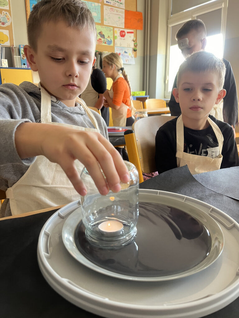 Podczas dzisiejszych zajęć młodzi odkrywcy z Rudnej Wielkiej mieli okazję przeprowadzić wyjątkowo widowiskowe doświadczenie z wodą, świeczką i odwróconym słoikiem🕯️. Po zapaleniu świeczki i przykryciu jej szkłem dzieci obserwowały, jak płomień powoli gaśnie, a woda zaczyna unosić się do wnętrza słoika.