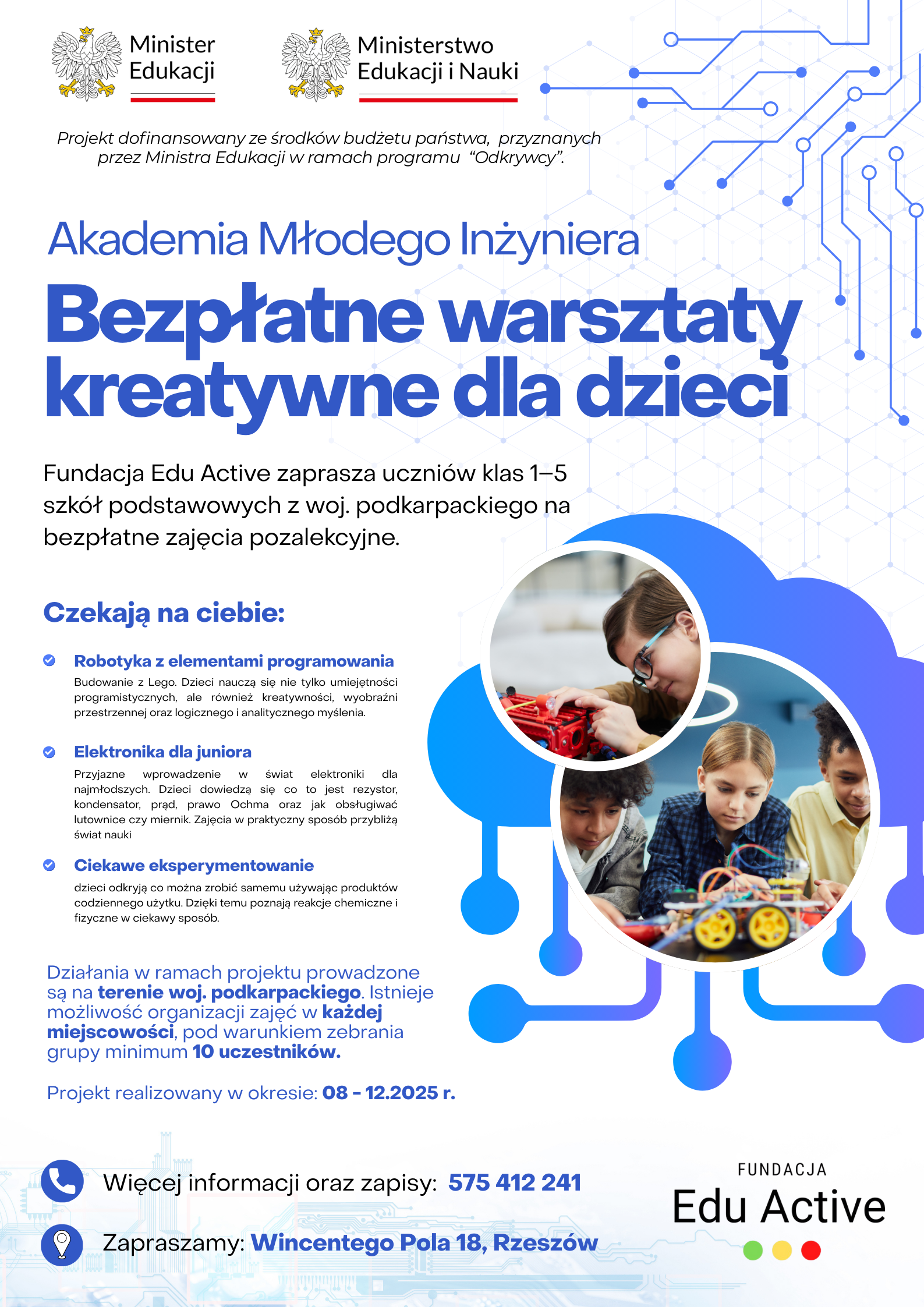 Z radością ogłaszamy, że rozpoczynamy rekrutację do projektu „Akademia Młodego Inżyniera”!Zapraszamy wszystkie dzieci z klas 1–5 szkół podstawowych z terenu województwa podkarpackiego, które chcą odkrywać świat lego, robotyki, elektroniki i ciekawych eksperymentów. 👉 W ramach